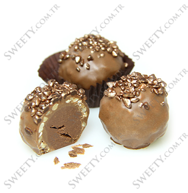 Hazelnut praline and milk chocolate paste coated with cocoa pieces.